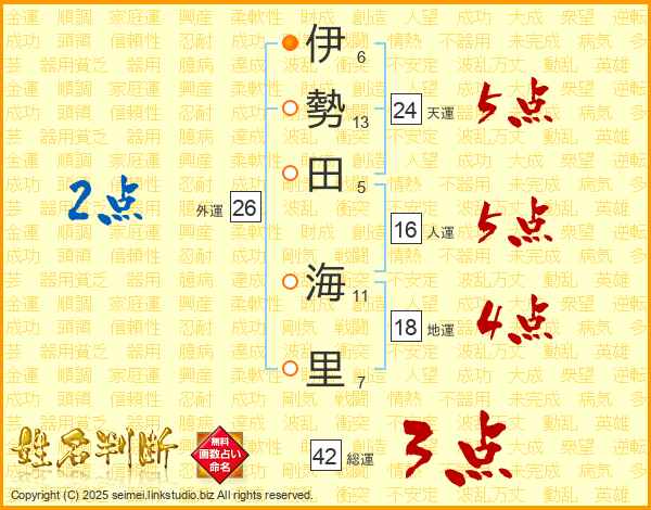 伊(6画)勢(13画)田(5画) 海(11画)里(7画)