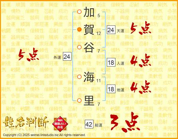 加(5画)賀(12画)谷(7画) 海(11画)里(7画)