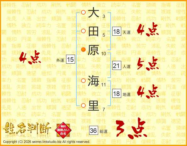 大(3画)田(5画)原(10画) 海(11画)里(7画)