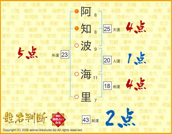 阿知波海里さんの総運は43画の2点!