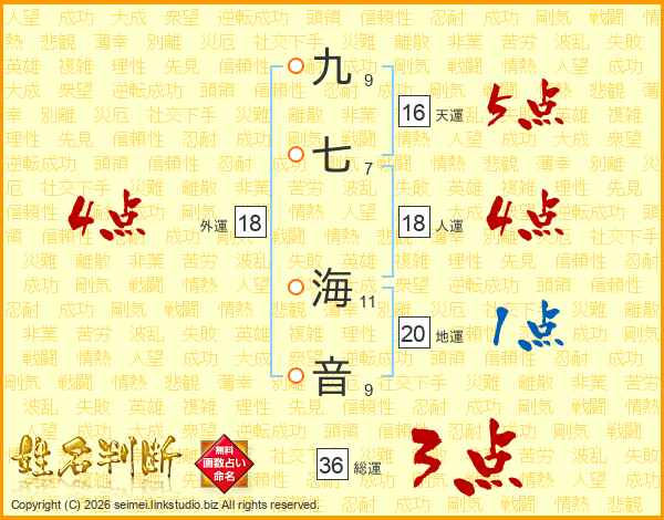 生活面を象徴する運勢です。外部から受ける影響力を表し、結婚運、家庭運や職場、環境への順応性を表します。総運から人運を引いた画数。姓や名が1文字の場合を除く。