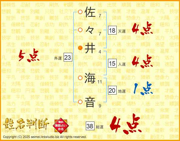 佐(7画)々(7画)井(4画) 海(11画)音(9画)
