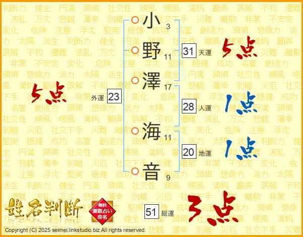 小(3画)野(11画)澤(17画) 海(11画)音(9画)