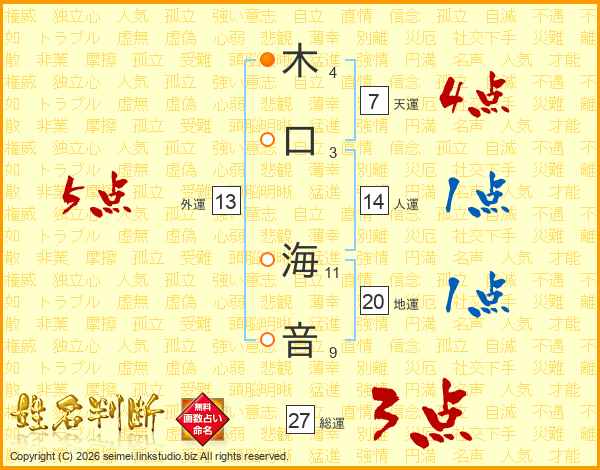 木(4画)口(3画) 海(11画)音(9画)