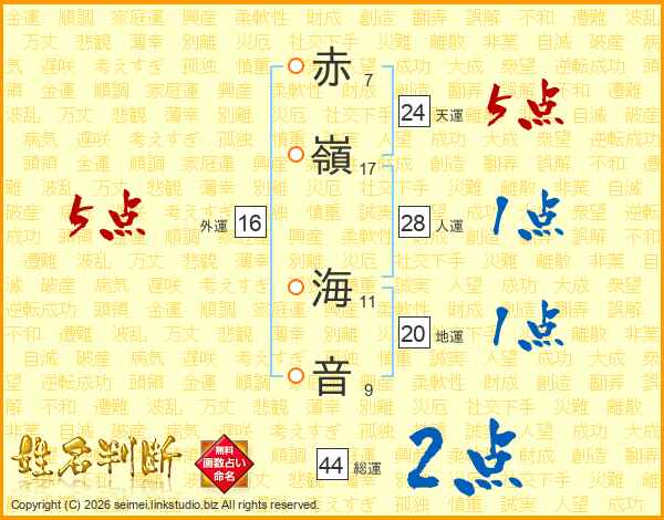 赤(7画)嶺(17画) 海(11画)音(9画)