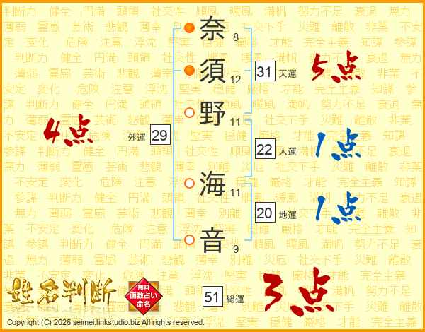 奈(8画)須(12画)野(11画) 海(11画)音(9画)