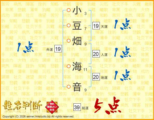 小豆畑海音さんの総運は39画の5点!
