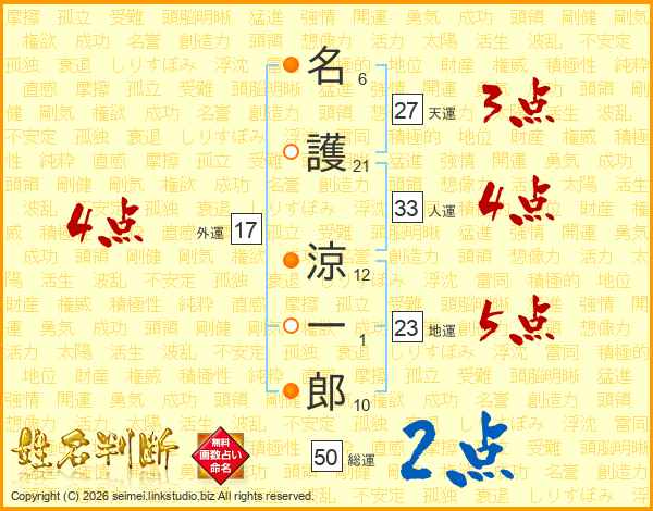名(6画)護(21画) 涼(12画)一(1画)郎(10画)