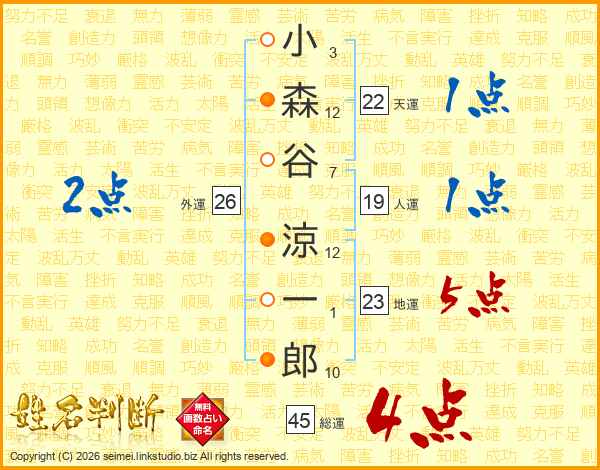 小(3画)森(12画)谷(7画) 涼(12画)一(1画)郎(10画)