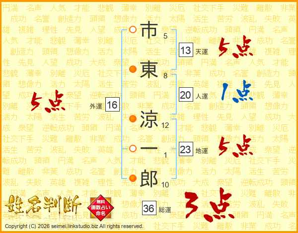 市東涼一郎さんの天運は13画の5点!