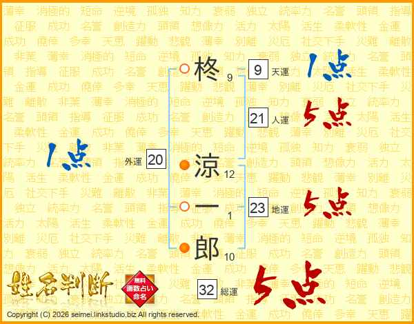 柊(9画) 涼(12画)一(1画)郎(10画)