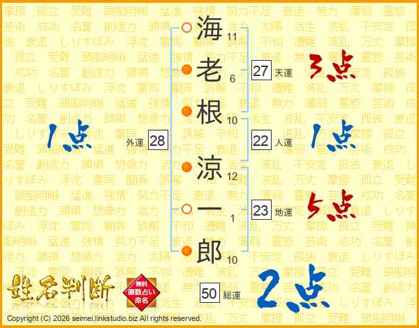 海(11画)老(6画)根(10画) 涼(12画)一(1画)郎(10画)