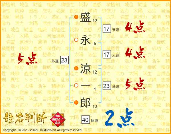 盛(12画)永(5画) 涼(12画)一(1画)郎(10画)