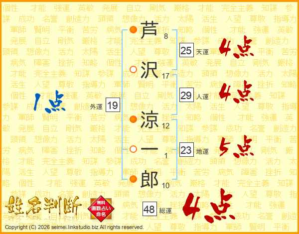 芦沢涼一郎さんの総運は48画の4点!