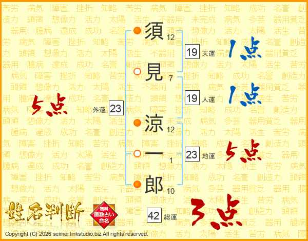 須(12画)見(7画) 涼(12画)一(1画)郎(10画)