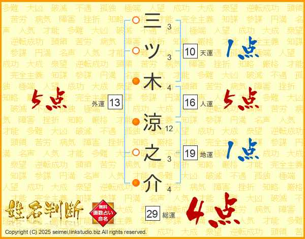三(3画)ツ(3画)木(4画) 涼(12画)之(3画)介(4画)