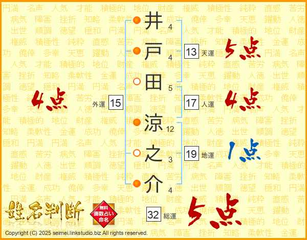 井(4画)戸(4画)田(5画) 涼(12画)之(3画)介(4画)