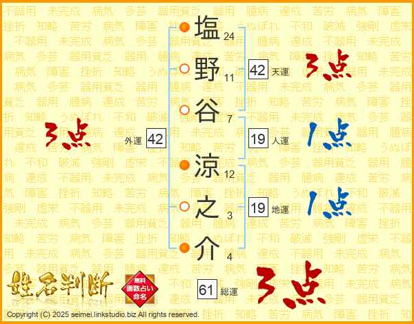 塩(24画)野(11画)谷(7画) 涼(12画)之(3画)介(4画)