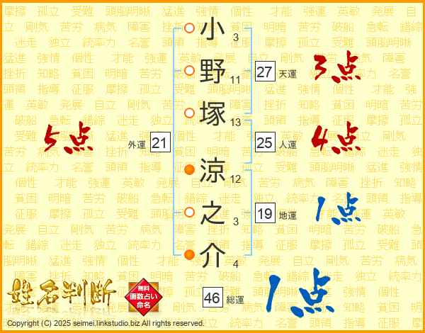 小(3画)野(11画)塚(13画) 涼(12画)之(3画)介(4画)
