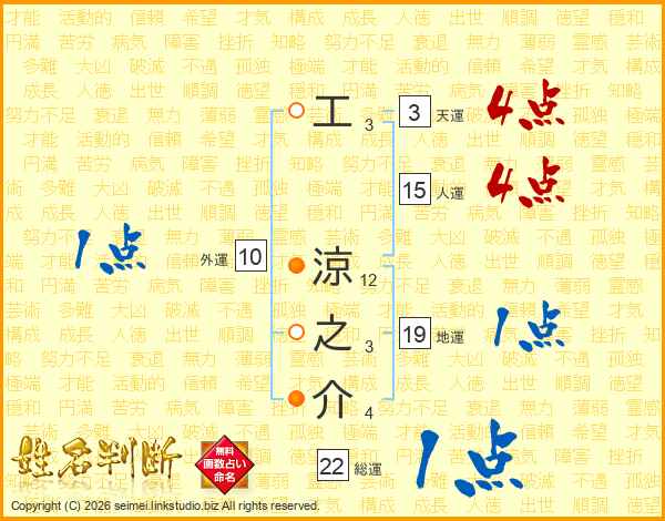 生活面を象徴する運勢です。外部から受ける影響力を表し、結婚運、家庭運や職場、環境への順応性を表します。総運から人運を引いた画数。姓や名が1文字の場合を除く。