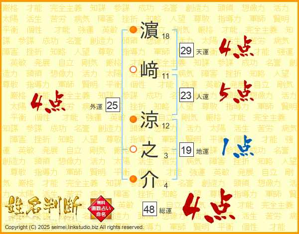 生活面を象徴する運勢です。外部から受ける影響力を表し、結婚運、家庭運や職場、環境への順応性を表します。総運から人運を引いた画数。姓や名が1文字の場合を除く。