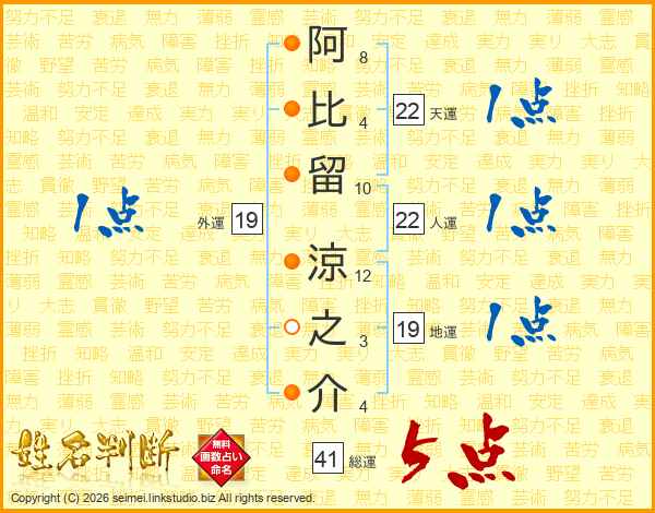 阿(8画)比(4画)留(10画) 涼(12画)之(3画)介(4画)