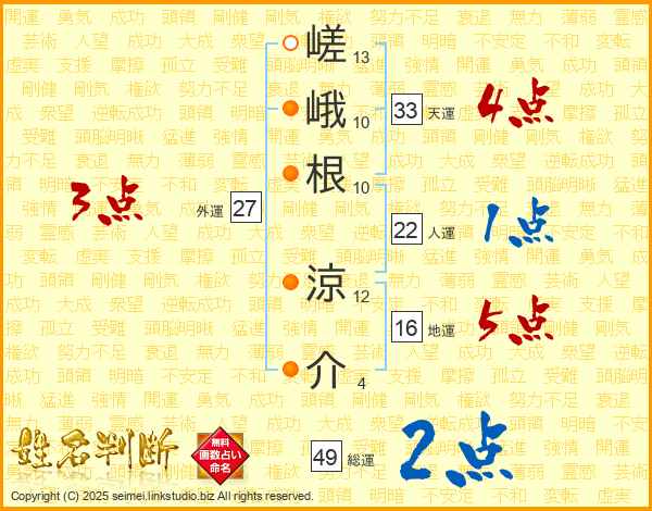 嵯(13画)峨(10画)根(10画) 涼(12画)介(4画)