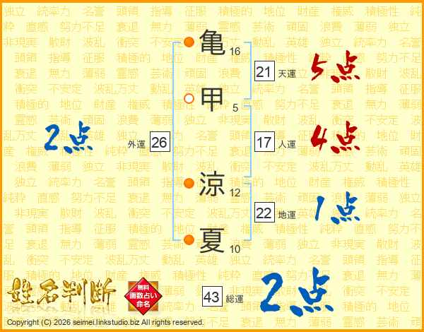亀甲涼夏さんの天運は21画の5点!