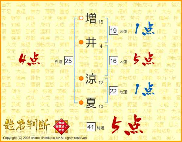 生活面を象徴する運勢です。外部から受ける影響力を表し、結婚運、家庭運や職場、環境への順応性を表します。総運から人運を引いた画数。姓や名が1文字の場合を除く。