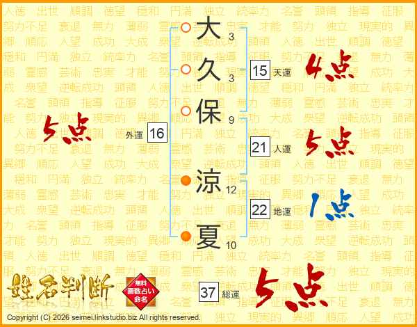 大久保涼夏さんの総運は37画の5点!