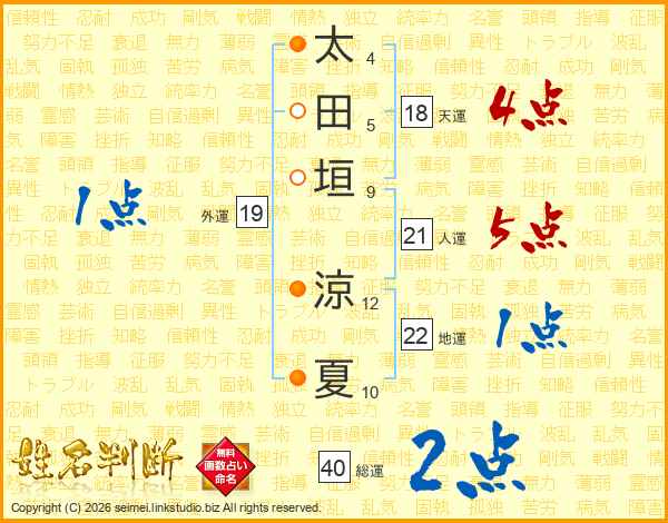 太(4画)田(5画)垣(9画) 涼(12画)夏(10画)