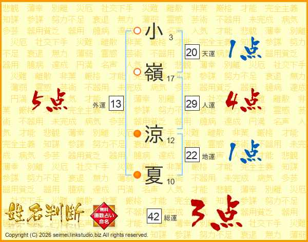 小(3画)嶺(17画) 涼(12画)夏(10画)