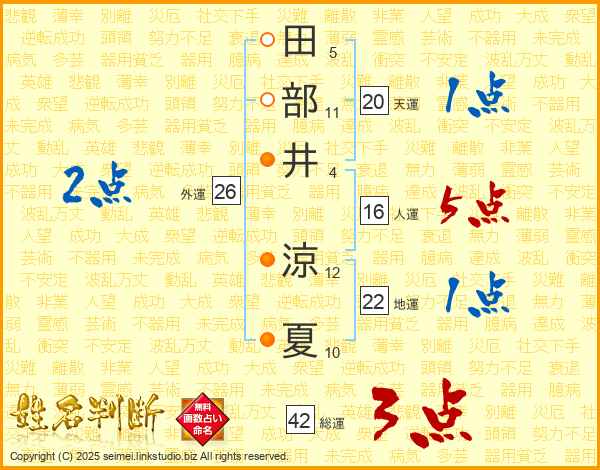 田(5画)部(11画)井(4画) 涼(12画)夏(10画)