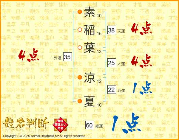 素(10画)稲(15画)葉(13画) 涼(12画)夏(10画)