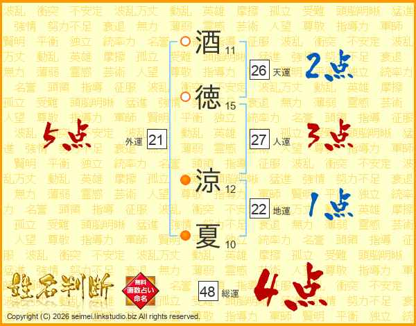 酒(11画)徳(15画) 涼(12画)夏(10画)