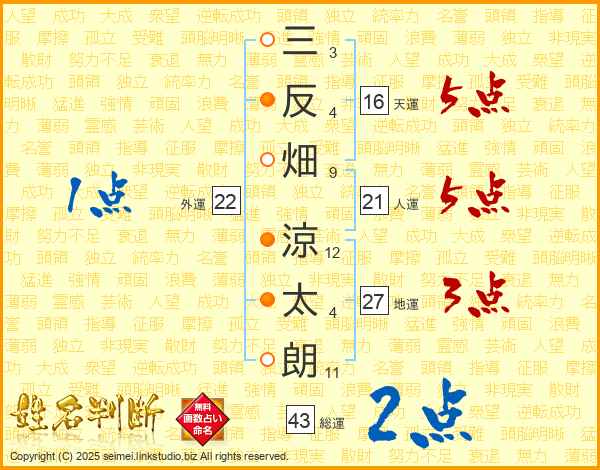 三(3画)反(4画)畑(9画) 涼(12画)太(4画)朗(11画)
