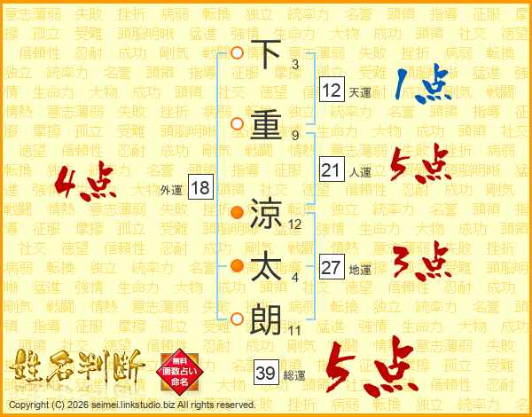 下重涼太朗さんの総運は39画の5点!