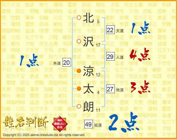 北(5画)沢(17画) 涼(12画)太(4画)朗(11画)