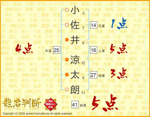 小(3画)佐(7画)井(4画) 涼(12画)太(4画)朗(11画)