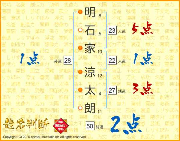 明(8画)石(5画)家(10画) 涼(12画)太(4画)朗(11画)