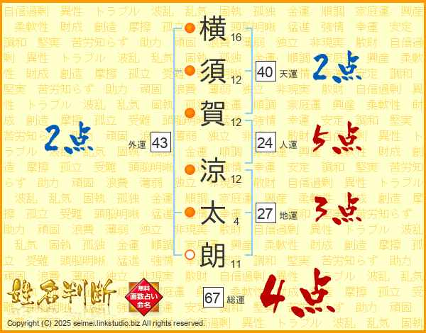 横(16画)須(12画)賀(12画) 涼(12画)太(4画)朗(11画)