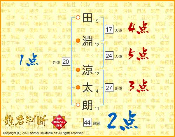 田(5画)淵(12画) 涼(12画)太(4画)朗(11画)