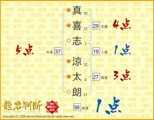 真(10画)喜(12画)志(7画) 涼(12画)太(4画)朗(11画)