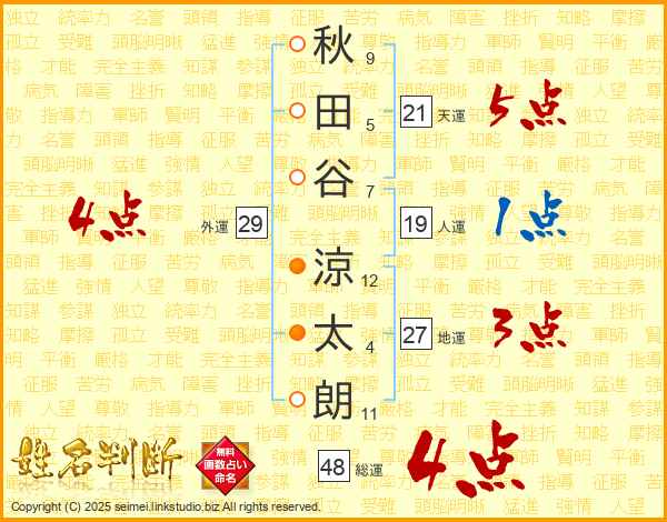 秋(9画)田(5画)谷(7画) 涼(12画)太(4画)朗(11画)