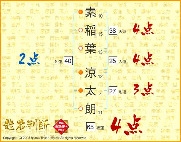 素(10画)稲(15画)葉(13画) 涼(12画)太(4画)朗(11画)