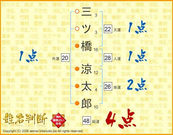 三ツ橋涼太郎さんの総運は48画の4点!