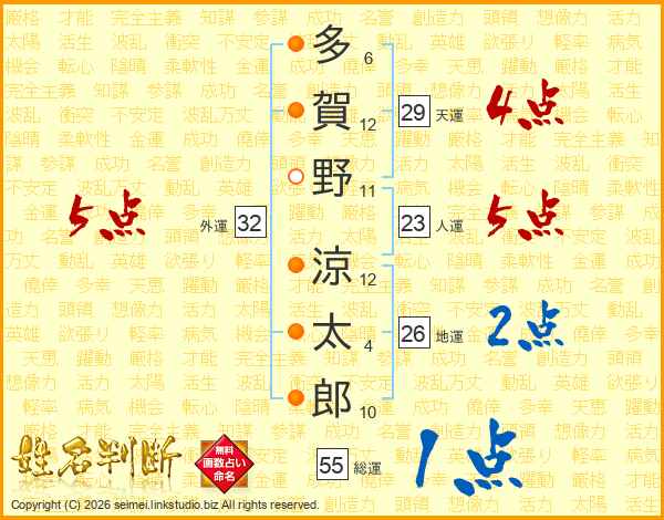 多(6画)賀(12画)野(11画) 涼(12画)太(4画)郎(10画)