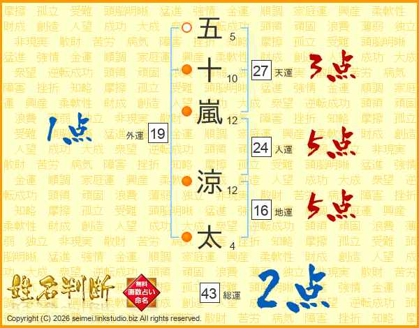 五(5画)十(10画)嵐(12画) 涼(12画)太(4画)