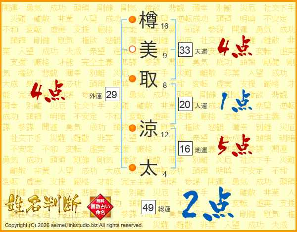 樽(16画)美(9画)取(8画) 涼(12画)太(4画)