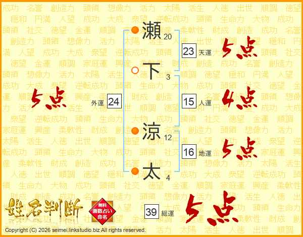 瀬(20画)下(3画) 涼(12画)太(4画)